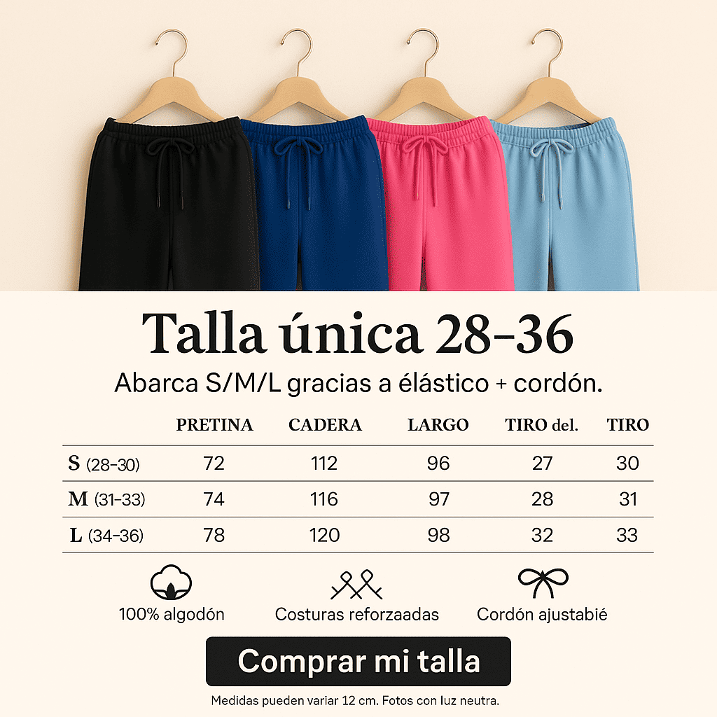 - Si dudas, elige la mayor; el cordón ajusta la pretina.